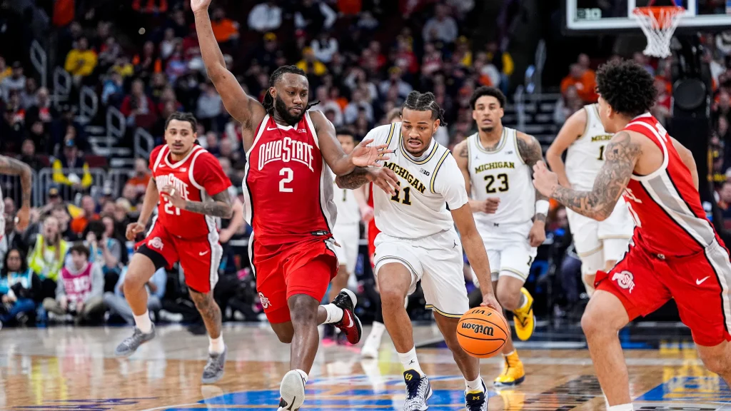 From the start of player intros, it was very evident that the arena was filled with maize and blue faithful who came to support top-seeded Wolverines. The underdog mentality was preached to the Buckeyes non-stop since the conclusion of the Iowa game and if so, the crowd only reinforced this. Michigan would jump to a quick 7-0 lead early as Ohio State struggled to keep possession or come down with rebounds.